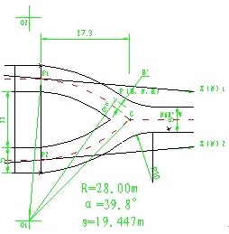当时设计代表提供了如图示的图形尺寸关系,以及C点大地坐标和其以外段的大地方位角,及其以内段的一些结构关系。如果单凭以往的经验和仪器条件,需要建立圆的方程,求解二元二次方程,才能求出圆弧对应圆心的大地坐标,之后才可进行下面的计算并结合仪器考虑放样方法。但是,我们将这个问题放到AutoCAD软件平台上来看,就变得非常简单了。具体操作如下: