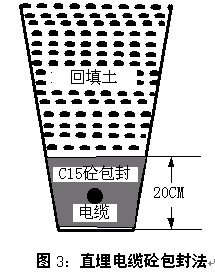采用电缆直埋方式,将电缆深埋于距地面60cm以下,这种方式本身具有一定的防盗效果,但电缆一旦被犯罪分子找到,采用机械牵引的方式仍旧容易实施盗窃行为。电缆直埋需要与混凝土包封相结合,才能起到更好的防盗效果。具体的做法有两种,一种是混凝土间隔包封,另一种是混凝土全程包封。