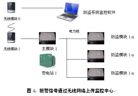 电缆防盗系统分为监控中心和监控前端两个层次,监控前端又分为监控主机和监控终端两部分。监控终端设置于每组供电回路的末端(即外场设备的室外配电箱内),监控主机可设置于收费站、停车区内,一个监控主机可以管理多个监控终端。监控终端与监控主机间采用扩频电力线载波技术进行通信,监控主机与监控中心设备之间采用有线通信系统或公网无线网络进行通信。