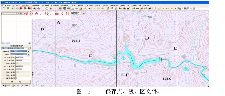 打开SECTION编辑窗口,在“文件”菜单栏中选择“新建文件”,可以看见主菜单栏出现“1辅助工具”菜单栏;接着,在该菜单下选择“打开外部数据”,继续在下一级菜单栏中选择“读取DXF文件”(如图 2);然后开始数据转换,需等待片刻转换完成。这里需注意几点:1、如果AutoCAD图层超过100个,选择“读取DXF文件(大文件)”,速度会慢一点,而且程序不会出错;2、生成的点、线、面文件,在窗口无法显示出来,这是由于在数据转换过程中,出现飞点、飞线,这需要在“2辅助工具”菜单栏中选择“删除飞点飞线”。最后,在编辑窗口菜单中“工作区”选择“存文件”,依次保存点、线、区文件(如图3)。