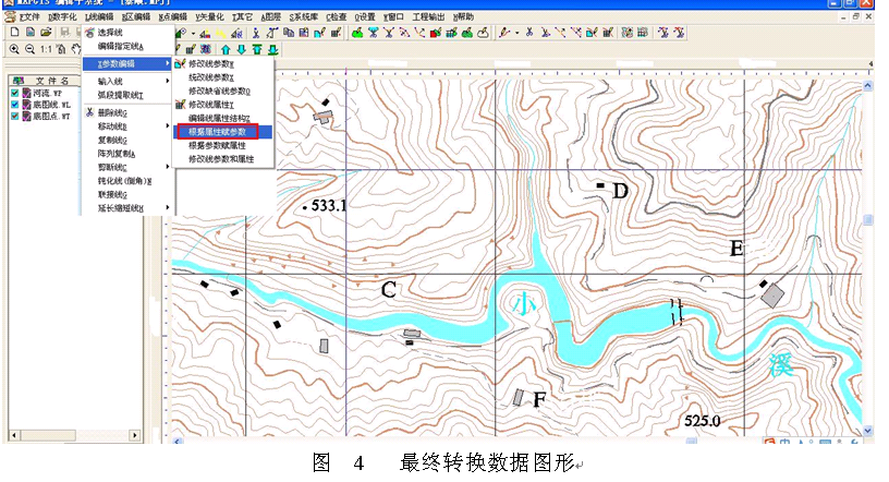 应用SECTION实现对AutoCAD的DXF格式与MAPGIS的MPJ数据转换,得到数据格式优点:(1)点文件、区文件基本和AutoCAD数据格式一样,不需要修改。(2)转换数据中点、线、面的颜色基本和AutoCAD的相同,减少了修改的工作量。(3)地形参数未发生变化,与AutoCAD相同。(4)线文件中线参数只有线型和线宽有变化,可以通过“根据属性赋参数”来简单修改参数。最后得到图形跟AutoCAD的图形基本一样(如图 4)。