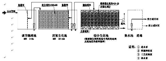 因综合污水的水质较为复杂,在前设立调节隔渣池,后接初级沉淀系统,以确保后续工艺的顺利进行,且如遇突发情况还能起到抗负荷冲击的作用。通过除渣并均匀混合后的污水由水泵提升至厌氧池处理进行厌氧生化处理,厌氧生化池内装放填料,并加入高效优势菌种。厌氧微生物附着于填料的表面生长,当废水推流通过填料层时,在填料表面的厌氧生物膜作用下,废水中的有机物被降解,并产生少量沼气,沼气从池顶部溢出。第一级厌氧生化池对于废水中的COD去除率能达到60%-80%。第一级厌氧生化处理后的一部分废水通过格栅冲洗泵返回对调节隔渣池和厌氧生化池的格栅网进行冲洗,另一部分废水通过工艺控制泵提升后进入第二级综合生化池。