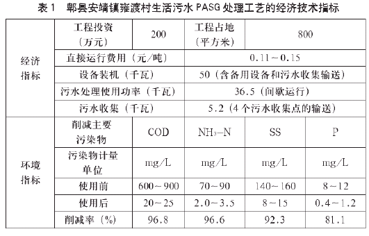 经该技术处理的生活污水出水COD等主要指标优于V类水体水质排放标准。处理费用为0.1~0.15元/m³,比采用常规技术的0.55~0.60元/m³低许多。若以一10000m³/日污水处理项目计算,每年就可以节省费用150万元,加上中水就地回用,其经济效益和社会效益是明显的。其它水处理工艺也可建成地埋式工程,但投资及运行成本偏高,如采用 A/O 法处理“中国第一水乡”周庄古镇生活污水的地埋式工程,投资成本为8714元/吨,污水处理成本为 0.931 元 / 吨。郫县安靖镇雍渡村生活污水 PASG 处理工艺的经济技术指标见表 1。PASG 工艺处理雍渡村生活污水的投资为 2000 元 / 吨,直接运行费仅为 0.11 ~ 0.15 元 / 吨,经济效益极为显著。化学需氧量(COD)、氨氮(NH3-N)、悬浮物(SS)和总磷(P)的去除率分别达到 96.8%、96.6%、92.3%和 81.1%。正常运行期间,可以减少化学需氧量的排放约为 282.87t/a、悬浮物约为 51.10t/a、氨氮约为 28.12t/a、总磷约为 3.36t/a。雍渡村生活污水 PASG 处理工程对减少污染物排放量、节约土地资源、减轻小流域水环境污染、改善农村生活环境质量起到了积极的推动作用。