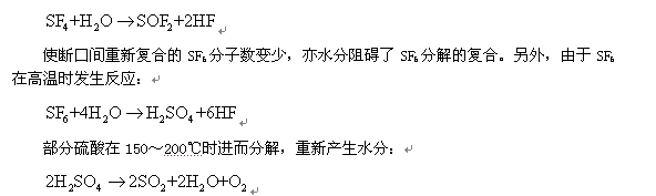 SF6被电弧分解后,主要的分解物是SF4+,其次是SF2+、SF5+、负离子F2-、F-及SF-,在电弧电流过零之后这些正、负离子很快(≤0.1ms)复合成负电性的SF6,使开关断口间的介质强度迅速恢复。水分的存在,对SF6电弧分解物的复合和断口间介质强度的恢复起阻碍作用。