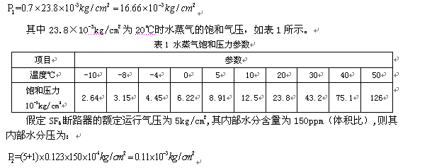 运行中的SF6断路器,虽然其内部气压要于外部大气压,但就水分而言,外部的水分压比内部的要大得多,如:环境温度为20℃,相对湿度为70%时,大气水分压为: