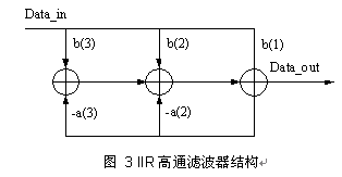 之所以采用IIR高通滤波器而未采用阻带滤波器,原因在于阻带滤波器是对称滤波器,干扰却不是对称出现的。IIR高通滤波器结构如图3所示: