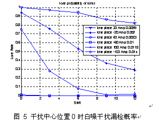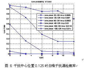 根据目前算法的理论分析,当干扰中心位置处在两个子载波位置之间的特定位置时会略微降低检测概率。白噪环境下,干扰中心位置为0、0.125时,各幅度干扰对应的漏检概率分别如图 5、图 6所示: