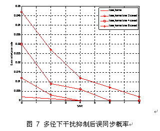 仿真中所加的干扰中心位置都正好位于子载波位置,干扰幅度均高出信号平台18dB左右。误同步包括丢帧和定点错误两种情况,多径环境下,干扰抑制后误同步概率如图 7所示: