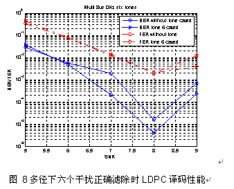 第一种情况是子载波位置存在干扰且接收端正确滤除。多径环境下,六个干扰正确检测且被滤除时接收端的LDPC译码性能如图 8所示: