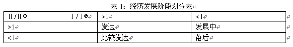 经济学家一般把经济发展类型划分为四种:发达地区、比较发达地区、发展中地区和落后地区。划分经济区域所采用的指标有两类:国民收入增长率(全国和本区域);人均国民收入(全国和本区域)。以2008年洛阳和全国的数据为例:国民收入增长率在全国和洛阳分别为9%和14.4%,国民生产总值在全国和洛阳分别为302853.4亿和1920亿,全国人口和洛阳人口分别为132802万人和654.4万人,则人均国民生产总值在全国和洛阳分别为22805元和29340元。把两项指标相比,得出14.4%/9%=1.6>1,29340/22805=1.29>1。根据以下经济发展阶段划分表(表1)将洛阳划分为发达地区。