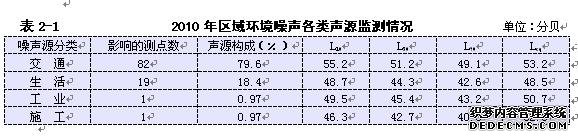 2010年,我市进行了区域环境噪声网格化监测,等效声级平均值为51.3分贝;从声源构成看,影响我市的噪声环境主要是交通噪声和生活噪声,具体监测情况详见表2-1。