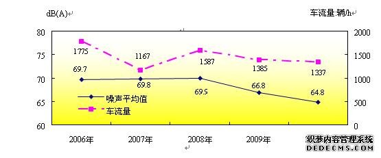 十一五”末期城市道路交通噪声平均等效声级64.8dB(A),比初期下降了7%;平均道路交通车流量1337辆/小时,比“十一五”初期下降了38.1%,(2006年9月)。