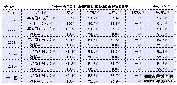 “十一五”期间,从监测结果来看,区域环境噪声由2006年54.9分贝下降到2010年51.3分贝,噪声平均值明显下降。