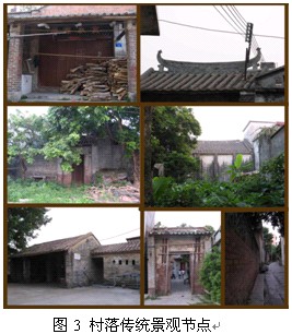巷一带,巷道的牌坊,大屋,石板台阶,排水小沟,院落都完整地展现出来;约与约,约与市之间都有牌坊隔开,大街的石板大部分保留下来;北约的花苑,私塾,大屋,大厅,鱼池集中于一处,基本形态也都保留下来(如图2,3示)。村中长者说大屋的砌砖是中间夹着一块钢板砌成的,所以哪怕是百年老屋,也坚固如初;就算已经日久失修,不再住人的屋子,甚至倒塌的屋子,山墙依然完整树立着。