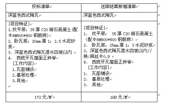 从上表可以看出,投标及送审结算的屋面清单,主要内容是没有改变的,但施工单位将其列为新增单价。根据该项目施工合同23.3.2(1)b和d的条款,合同中已有适用于变更工程的单价,套用合同单价;合同中只有类似于变更工程的单价,参照类似单价;合同中没有适用于类似变更工程的单价,则套用新增单价。屋面清单应参照原投标单价,镀锌铁丝换成铜丝,1:2.5水泥砂浆20厚换成1:3水泥砂浆25厚,最后单价调整为176元/M2。