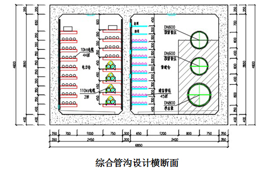 在确定综合管沟断面尺寸时,首先应确定设置在此段管沟内管线的种类、数量,然后根据管线种类、管径大小、管线坡度要求、管理便利等因素来布置。原则上应尽可能地把同性质的管线布置在同一侧;当管线种类较多时,应把电缆、控制及通信线路设在上侧;横穿管廊的管线应尽量走高处,以不妨碍管沟内通行为准;管线之间的上下间距及左右间距应满足相关规范要求;当断面受限制不可能加大而管线又太多布置不开时,可将小口径管线并列布置,中间留出一定的人行通道宽度。