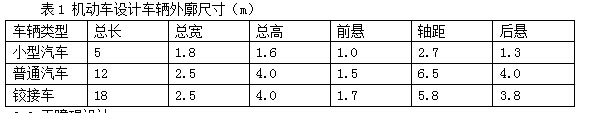 一般的,机动车设计车辆外廓尺寸主要以三种车型为依据:小型汽车、普通汽车和铰接车 (见表1)。这里总高为车厢顶或装载顶至地面的距离,而总长是指车辆前保险杠至后保险杠的距离。拿小型汽车来说, 规范要求的参照标准为总长 5m、 总宽 1.8m、 总高 1.6m、 前悬 1.0m、 轴距 2.7m和后悬 1.3m。但是在实际中随着经济的高速发展,小型汽车已经进入了千万家,也出现了多种不同尺寸的小型汽车,有吉普车,有加长轿车,越野车等等,好多车总长超过了 5m,有的甚至能达到 5.8m。有的小型汽车的总高要超过 1.6m,好多小型轿车如新奥迪 A6 等车宽都在 1.8m 以上,车长不同,它的转弯半径也就不同。故用总长为 5m 等指标作为设计尺寸的规范已不能包括所有的小型汽车了。设计工作者在设计时应注意到这个问题。