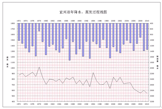 宜兴地处江苏南端,是太湖上游水源敏感区,随着城市化建设的不断加快,许多高楼大厦拔地而起,据统计,宜兴房屋施工面积从2005年244.99万m2增至2009年264.11万m2,而到2010年已达425.57万m2,这么多房屋的建成,使宜兴城区的地表发生了凹凸不平的变化,对宜兴城区水文蒸发产生了一定的影响,就宜兴水文水面蒸发而言,正在逐年减少,我们可从下面这张宜兴逐年降水、蒸发过程线图中看出,2006年之前,观测到的年蒸发量与年降水量对比具有一致